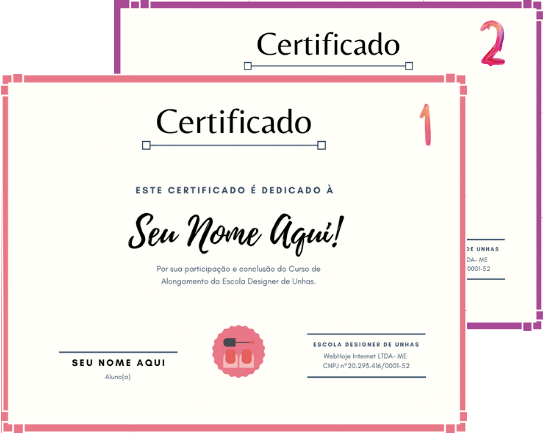 O curso contém 2 certificados, pois, um certificado é em Alongamento de Unhas e outro e em “Nail Designer”. Os 2 Certificados estão disponíveis para as alunas após 7 dias consecutivos de curso.